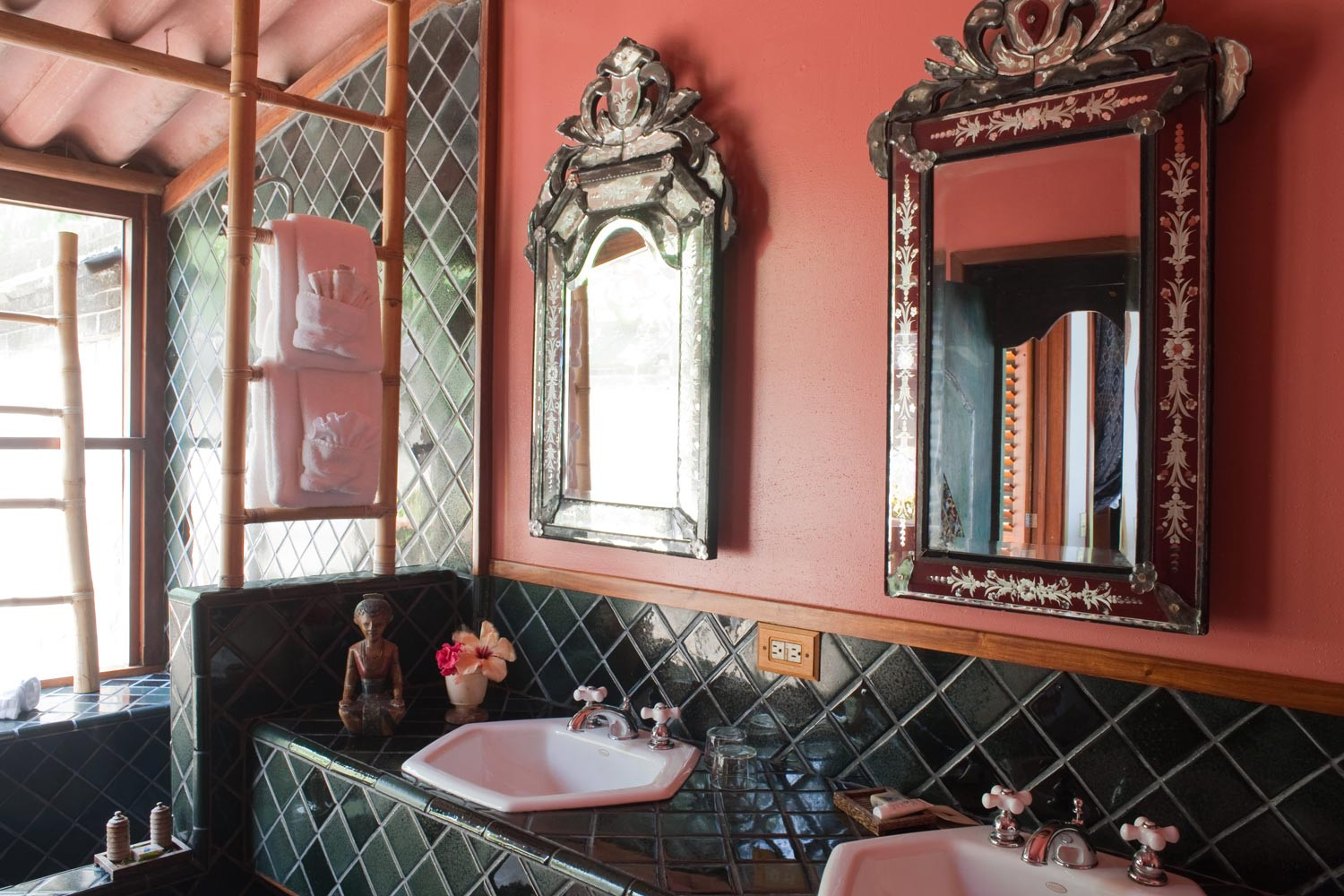 With a partial view of the Caribbean Sea, each Seaview Cottage at our luxury hotel hideaway in Belize has a screened porch, spacious bathroom with a Japanese bath, and a private walled garden with an outdoor shower. All rooms feature Balinese hand-carved doors and décor, ceiling fans, and thatched roofs that naturally cool the cottages. If you prefer Belize hideaway dwellings that look out onto the Caribbean Sea, be sure to check out our luxury Seafront Cottages at Turtle Inn, just steps away from a beautiful stretch of beach.