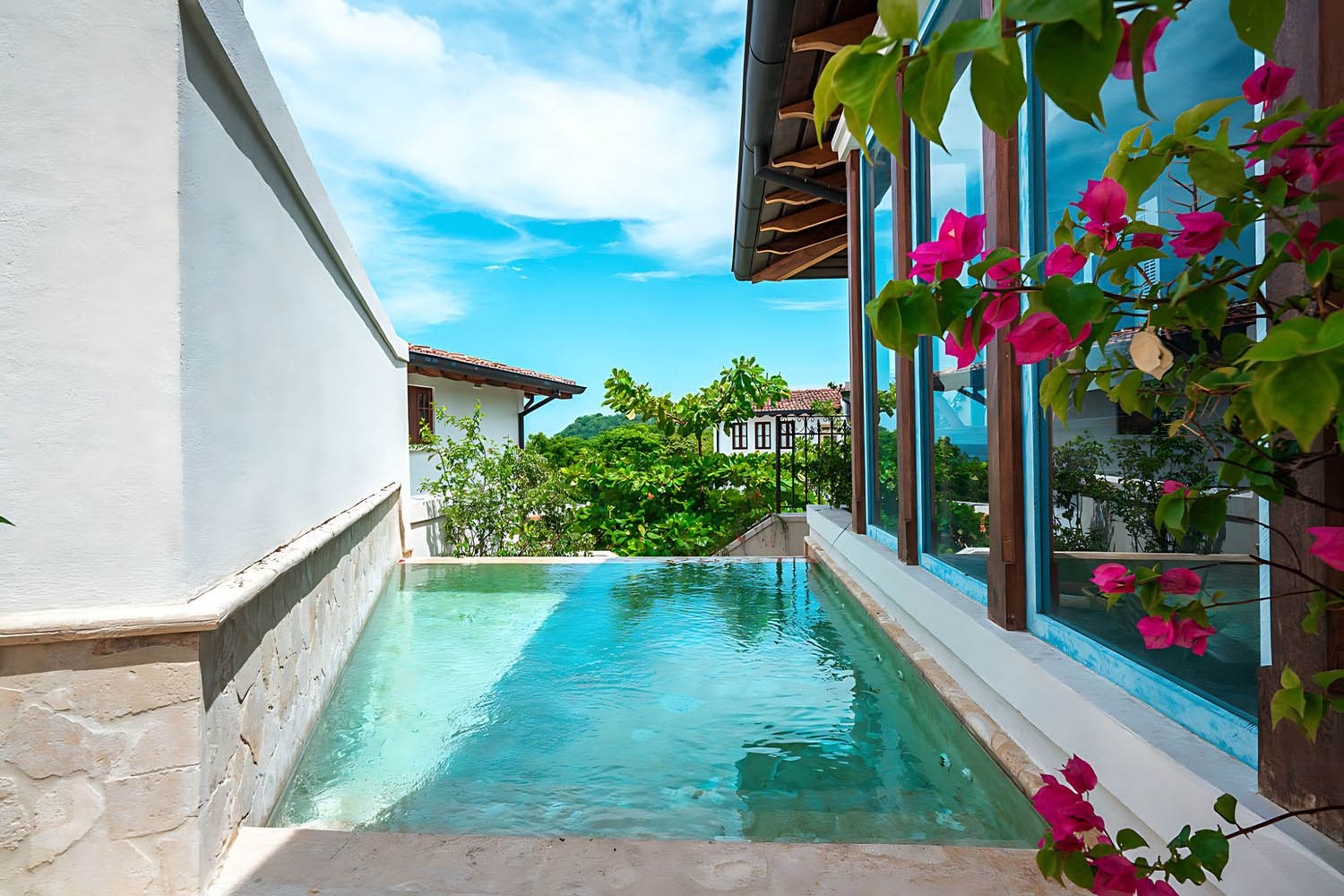 4 Bedroom | 4.5 Bathroom | Sleeps 10 Step into 9 Calle Cartagena, a charming residence conveniently located near the heart of town with stunning ocean views. Ideal for large groups or families seeking a luxurious retreat, this property features ample amenities in a one-of-a-kind space. Step inside, where you’ll be greeted by vibrant decor and thoughtfully designed rooms. This home features two master bedrooms, each with a king bed and ensuite bathroom. The first master bedroom boasts a private balcony with stunning ocean views, while the second master bedroom includes a lower terrace with views of the town; both are perfect for a morning coffee moment. The third bedroom includes a queen bed and an ensuite bathroom with a standalone shower. The fourth bedroom is ideal for children or additional guests, as it has two sets of twin bunk beds and an ensuite bathroom with a tub. The living room is a central gathering space with funky decor, a live-edge wooden coffee table, and large windows that flood the room with natural light. It’s the perfect place to unwind, socialize, or enjoy a movie night after a day at the beach. Adjacent to the living room is the kitchen, featuring a center island and a work-friendly area with a power outlet. The kitchen flows seamlessly to the covered terrace, which has seating for ten and a pool, making it perfect for al fresco dining. Go for a morning swim, grill out with your family, and take in ocean vistas. In addition, this home includes a rooftop terrace with a gas BBQ and high table, another space perfect for group dining. Bedrooms and Bathrooms Third Floor Master Bedroom 2 | King bed, full ensuite bathroom with standalone shower. First Floor Master Bedroom 1 | King bed, full ensuite bathroom with standalone shower. Guest Bedroom | Queen bed, full ensuite bathroom with standalone shower. Guest Room | 2 sets of twin bunk beds, full ensuite bathroom, bathtub, and standalone shower.