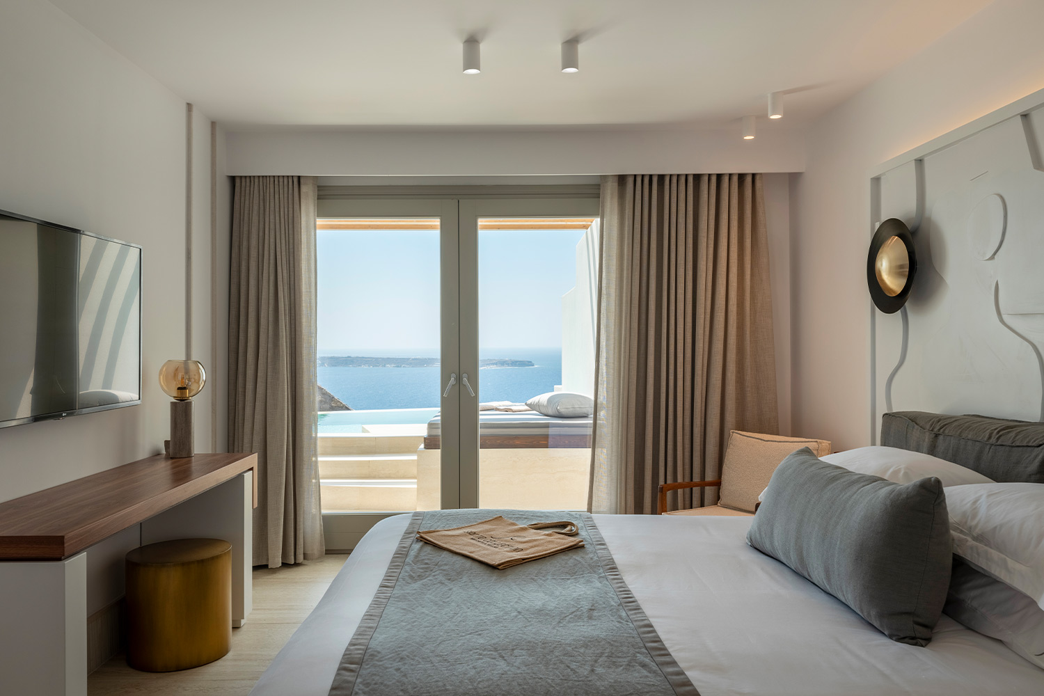 Bathed in the reviving light of the Aegean, this spacious hideaway of 32-42 sqm. offers the perfect setting for those seeking moments of seclusion. 32 – 42 sq.m. Up to 3 guests Sunset & Sea Private Pool Open Plan