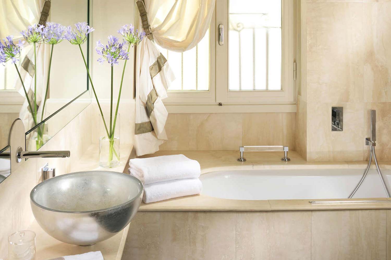 For a romantic weekend, book a junior suite in Florence Italy in the historic center of the city, treat yourself to the sensual luxury of an exclusive and refined hotel. At the Brunelleschi there are two particular types: the 410 sqft Junior Suite Executive overlooking Piazza della Repubblica with a double bedroom, lounge and bathroom with bathtub and shower; the 432 sqft Junior Suite with internal view with double or twin bedroom, lounge and bathroom with whirlpool tub and shower. The reservation of these types of suites always includes a transfer from Santa Maria Novella station or from Florence airport, to enjoy a carefree hotel stay. Junior Suite Executive The Junior Suite Executive is a luxury Suite in Florence thought for refined tourists and demanding business people who seek comfort and elegance. Recently renovated, it faces the well-known Calzaiuoli street, heart of the Florentine shopping district, and boasts a spectacular view on Piazza della Repubblica. This luxury suite type has a minimum size of 410 sq ft. and comes with a comfortable kingsize bed (79 inches long and 79 in.wide) and a four poster bed offering the anatomical Privilege Beautyrest Simmons mattress. Each bedroom is completed with feather and hypoallergenic pillows. The large bathroom is fully equipped with a bathtub and a shower in the bathtub, fluffy bathrobes as well as the courtesy line with ‘soft touch’ bottles. The suite has distinctively been designed in contemporary style with oak parquet floor. The interiors elegant design was expressly created for the luxury 4-star Hotel Brunelleschi to complement its location in the center of Florence.