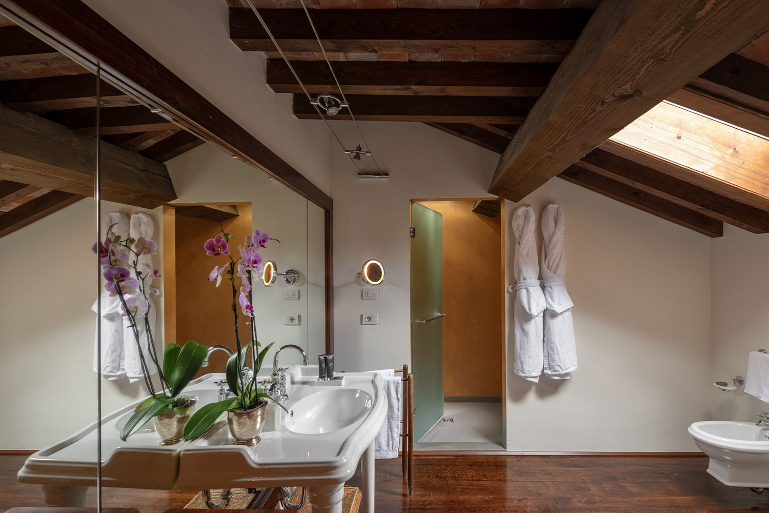 Each Suite is a story in itself—distinct in layout, color, and character. Spanning 80 sqm, these beautifully appointed spaces blend historical charm with modern indulgence. Expect details like a marble font repurposed as a sink, antique fireplaces, and original oil paintings by Gabriel Van del Leeuw (“il Fiammingo”). Ideal for travelers who appreciate both comfort and cultural richness, select suites can also host an extra bed.