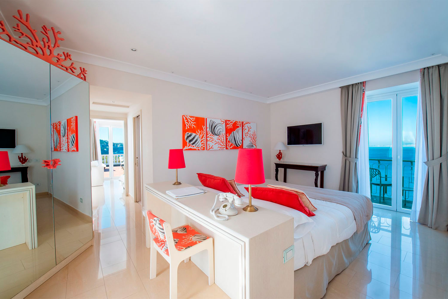 The Suite is the most prestigious room in the hotel, romantic and comfortable comprising living room and bedroom with a total of 60 sqm. It has a balcony and terrace of 20 sqm with sun loungers affording breathtaking sea views over the gulf of Naples. Room Amenities: free wi-fi connection, air conditioning, minibar, direct dial telephone, wardrobe with safety deposit box, LCD flat-screen tv 32 inch, with satellite antenna connected to the major national and international television channels, work desk with lamp and kettle. The bathroom is decorated in with ceramics from Vietri and is equipped with a hydromassage bathtub overlooking the sea, hair dryer, bathrobes, slippers and specially sourced toiletries. On request we can arrange candlelit dinners on the private terrace of your room.