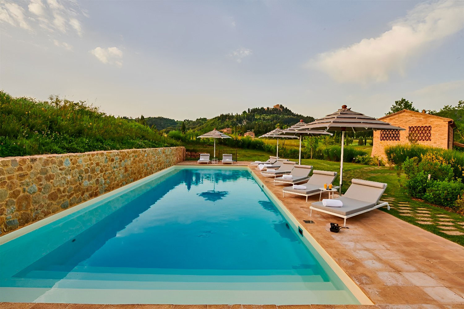 Elegant two-story villa surrounded by hills in perfect Tuscan style. It features three bedrooms, a private garden with an equipped veranda and a swimming pool. Surrounded by greenery within the golf course, this villa has a large and bright living room with fireplace and a fully equipped kitchen. The double bedroom is on the ground floor while the two twin bedrooms are on the first floor. Outside, the dining area and the swimming pool make villa Il Fienile the perfect place to spend your holidays in total relaxation.