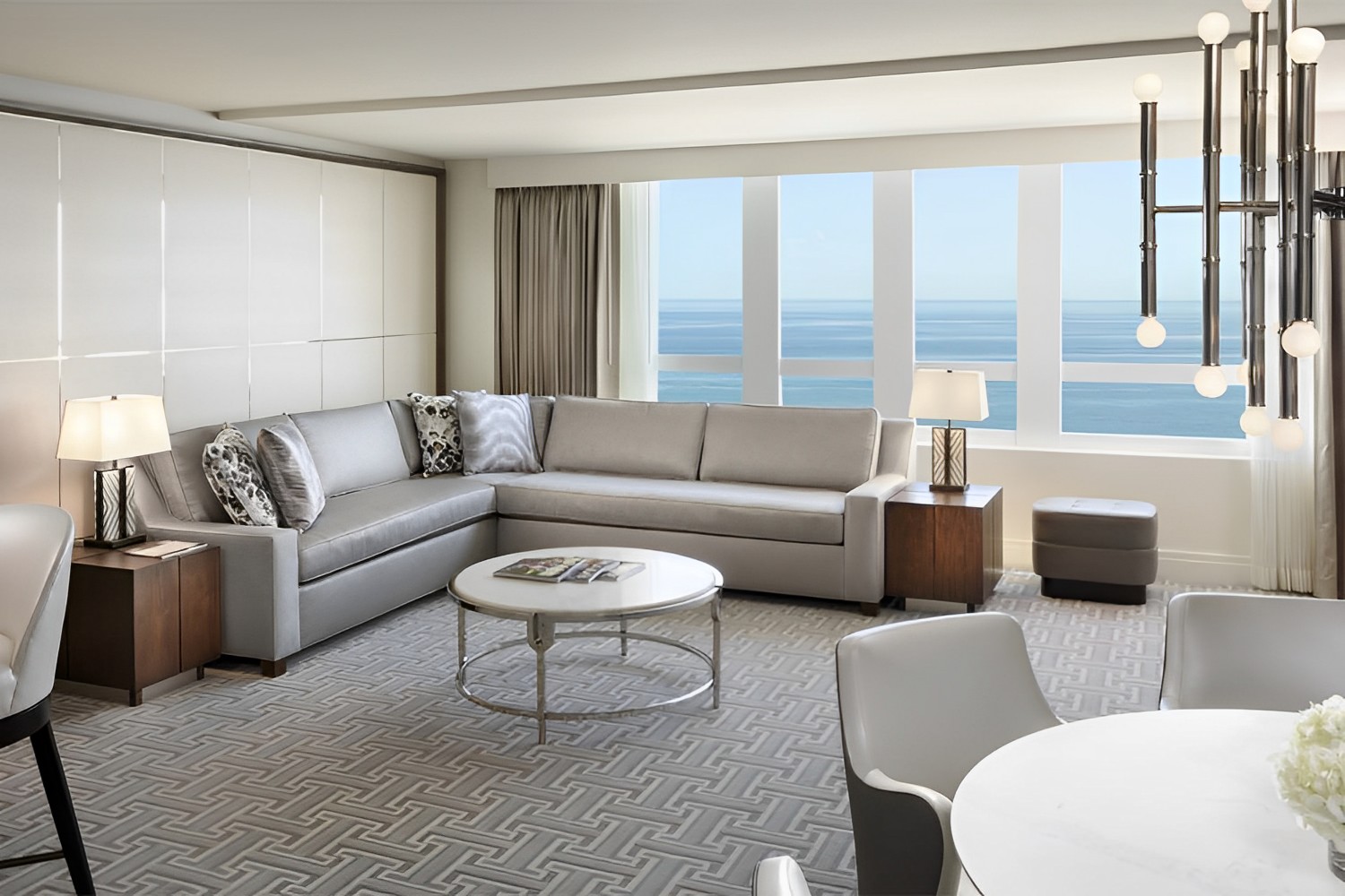 1115 SF 1 King 1 ½ Bath Balcony Option The perfect place for a special occasion, with an abundance of space. Invite guests to marvel at the view and elegance interior featuring a wide range of amenities, large dining room table, wet bar, 55” HD TV, and additional powder room. Enjoy the privacy of your separate bedroom, and bath featuring an oversized jet whirlpool tub and walk-in shower.