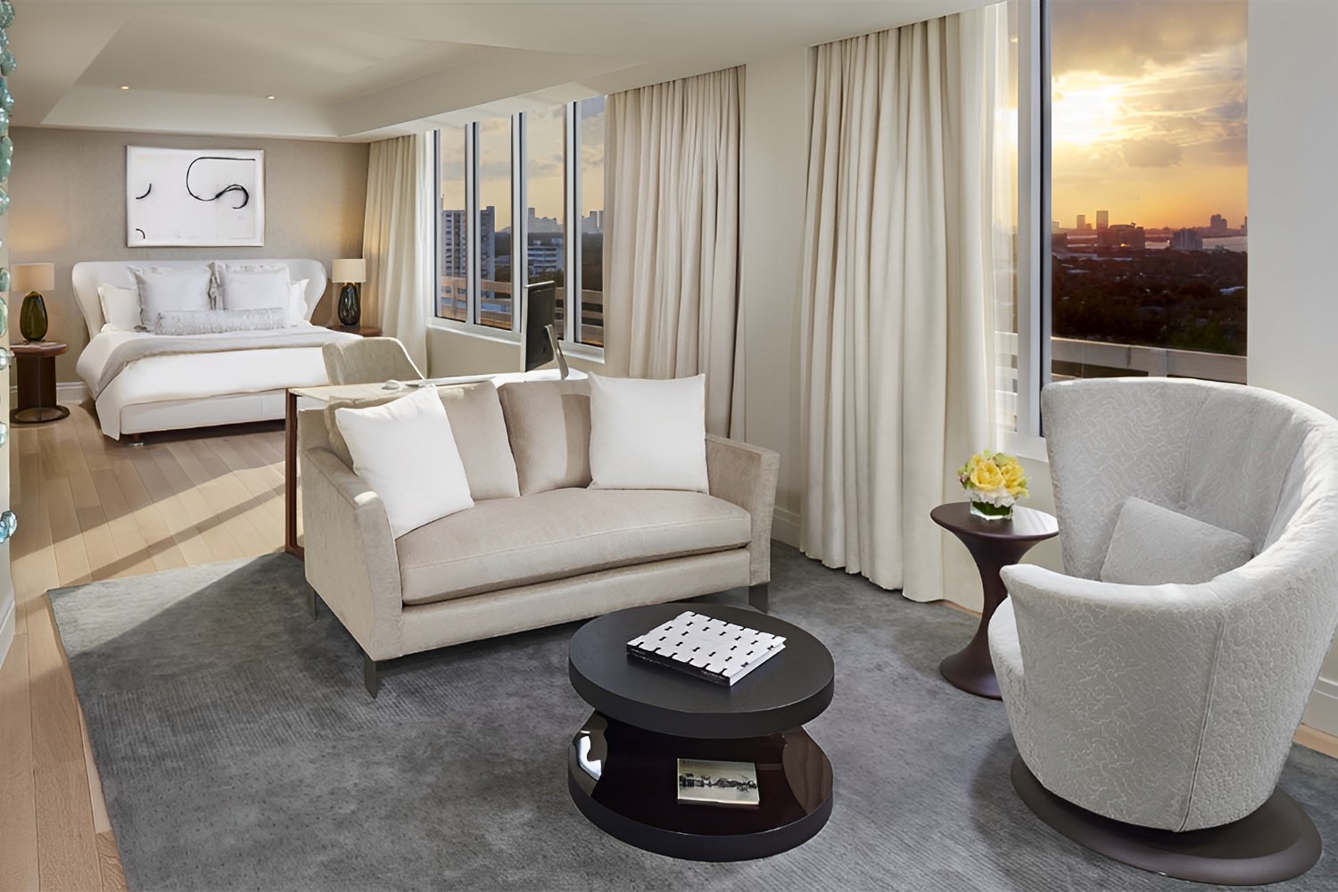 2400 SF 2 Bedrooms: 1 King & 2 Queen 2 Bath Welcome to the largest accommodations in Fontainebleau’s historic Chateau Tower. At an astonishing 2,400 square feet, the Presidential Suite has served the needs of many A-List celebrities and world dignitaries who have visited since 1954. Glide across the polished marble floors throughout the living room, sitting room, and dining area. Move the party from the lavish wet bar to your separate entertainment room or spacious living room with stellar views of the Atlantic Ocean, Downtown Miami and Biscayne Bay. The master bedroom offers a king bed, 40” HD TV, and private bath with floor-to-ceiling custom marble. The star treatment never ends, with the spacious second guest bedroom featuring two queen beds, also featuring a custom marble bath. The stage is set for an incredible stay that sets the standard of luxury in Miami. Please note, the La Baie Presidential Suite does not have a balcony.