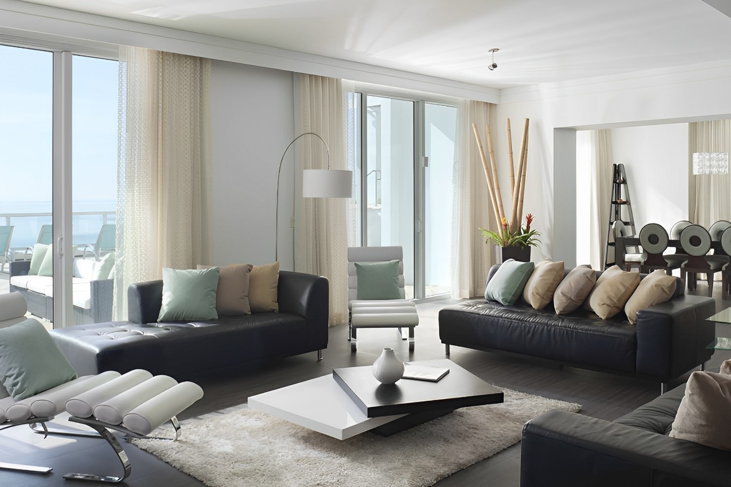 9850 SF 5 Bedrooms 5 ½ Bath Kitchen Create a lavish beachfront vacation for friends and family in this five-bedroom, two-level escape, covering almost 10,000 square feet. Get inspired by sweeping views of the Atlantic Ocean and Fontainebleau’s pools. This multi-level suite features an amazing 4,400-foot balcony, perfect for private entertaining and sunbathing, complete with your own private pool and Jacuzzi overlooking the Atlantic. Make yourself at home in the open plan living room featuring a 60” TV. Entertain guests in the adjacent formal dining room for eight. This magnificent suite features a full kitchen with Sub Zero fridge, Miele appliances and wine cooler. Also on the main level, a sprawling bedroom you’ll want for yourself, featuring a king bed with oceanfront balcony, 55” HD TV and walk-in closet. The master bath is your personal oasis featuring a steam shower, Jacuzzi tub and 55” HD TV television. The second level offers three luxurious king and queen bedrooms, featuring balconies and 55” HD TVs. Experience all that this private getaway has to offer, knowing the rest of Fontainebleau is right at your fingertips.