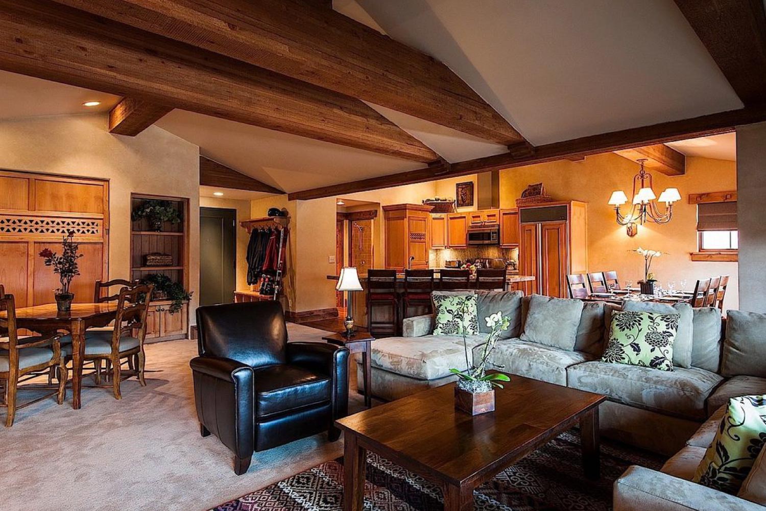 The spacious Deluxe Studio rooms offer guests 750 square feet of flexible living space. Studios have full kitchens, dining areas, and spacious living rooms. Living room features include a gas fireplace and a queen Murphy bed. The kitchen provides a coffee maker, microwave, refrigerator, and toaster. Room amenities include a flat-screen HD television, DVD player, complimentary wireless Internet, and in-room safe. The bathroom includes tub/shower, heated towel racks, plush robes, signature bath products, humidifier, iron and ironing board, and hairdryer.